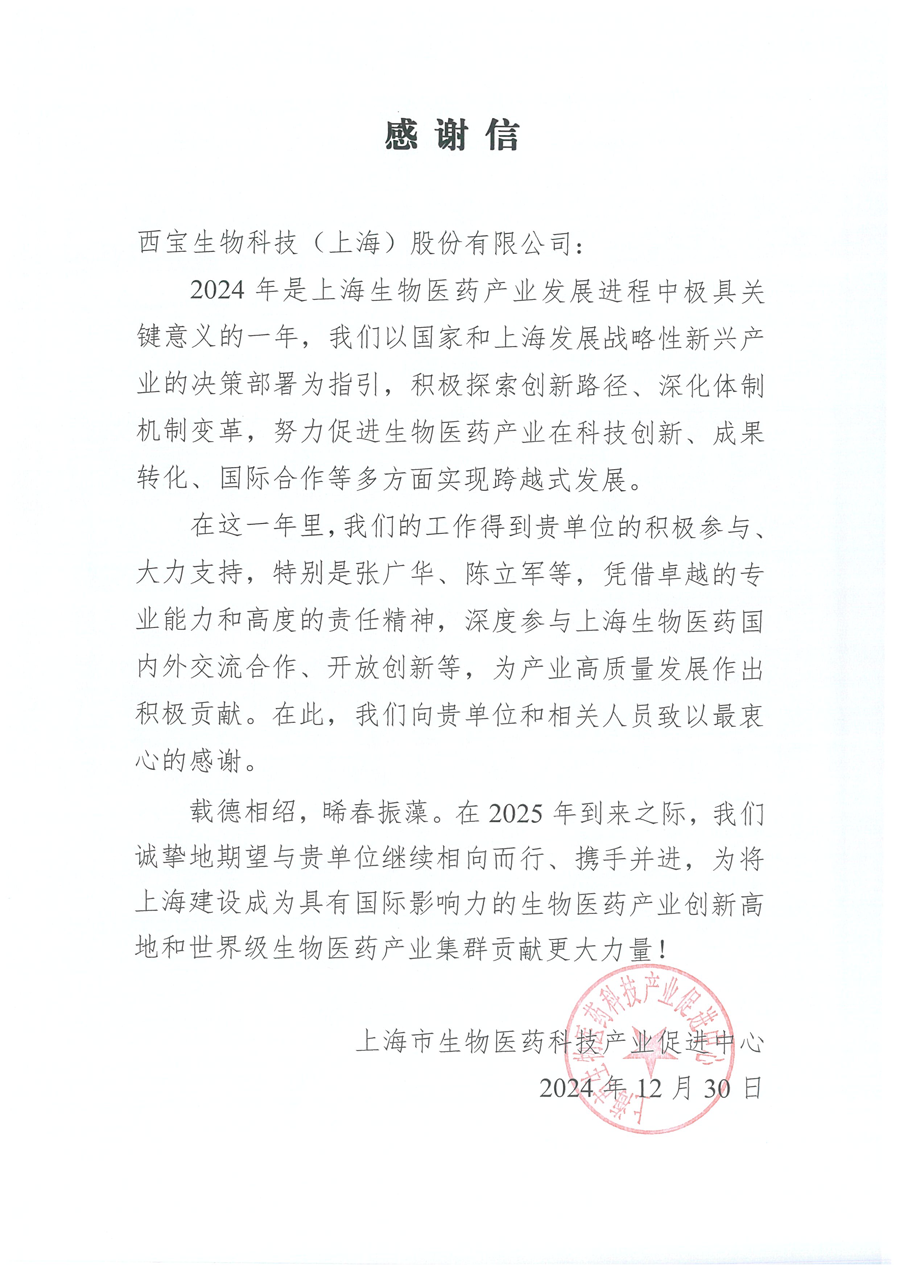 即將告別龍年,邁入嶄新的蛇年,在此之際,西寶生物收到一封來自上海市生物醫(yī)藥科技產(chǎn)業(yè)促進中心特別的年終感謝信,紙箋傳情,雙向奔赴。